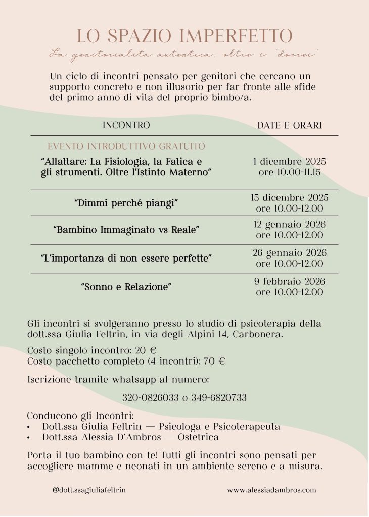 In questo tempo prezioso, l’ostetrica offre un accompagnamento delicato e competente, aiutando i genitori a leggere i bisogni del neonato, a prendersi cura della mamma nel suo recupero fisico ed emotivo e a ritrovare armonia nella nuova vita familiare.